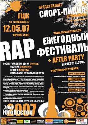 Ежегодный RAP фестиваль Юго Восток ZONE 2007 будет порходить в ГЦК (г.Гомель, ул. Ириницкая 16), начало в 18.00.
